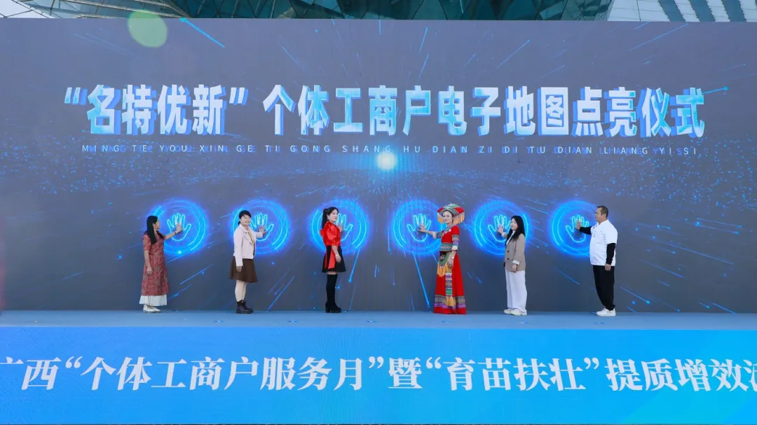 活动现场,广西扶持个体工商户发展厅际联席会议单位联合有关企业发布了“政企携手·同心同行”助力个体工商户发展政策礼包,涵盖稳岗扩岗、创业扶持、减税降费、融资对接、数字赋能等多维度惠企措施,为个体工商户提供全方位支持;发布了广西市场监管服务监督卡,并推介“广西经营主体服务网”,推动服务模式从“被动接诉”到“主动服务”转变;发布了“个体工商户、私营企业主题银行”服务点建设指南,并为A类个体工商户代表颁发信用评价报告,助力经营者“信用变现”;点亮了广西“名特优新”个体工商户电子地图,通过打造可识别、可导航、可消费的品牌矩阵,提升“名特优新”品牌影响力。启动仪式后,还举办了广西“名特优新”个体工商户商品展。